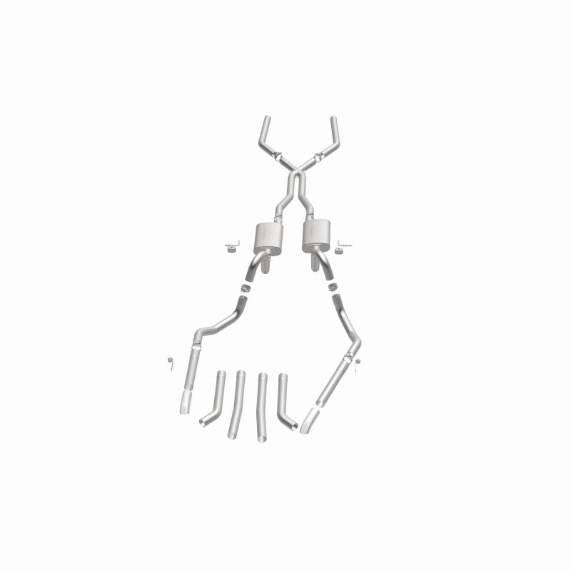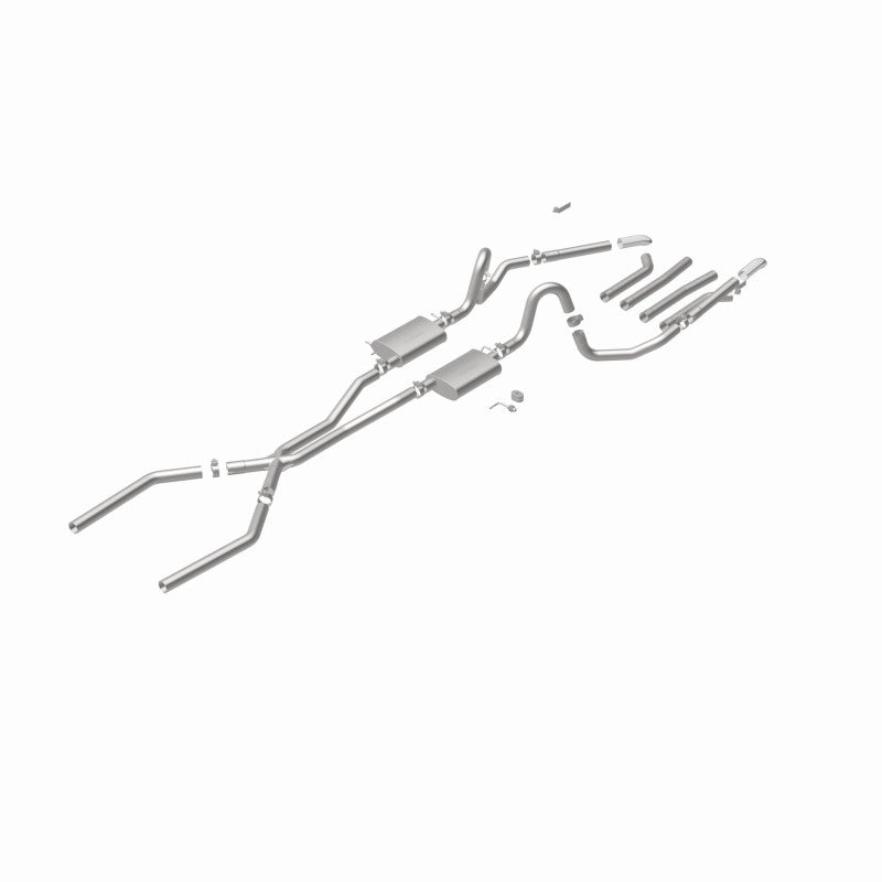 The MagnaFlow Street Series Crossmember-Back Performance Exhaust System 15893 brings enhanced engine sound and dyno-proven performance to your muscle car with a healthy helping of our deep, resonant signature exhaust note at Moderate exterior and Mild interior sound levels. Thanks to its durable, corrosion resistant stainless steel design, this exhaust system will handle whatever tarmac you decide to leave your mark on. This performance exhaust kit features a crossmember-back layout designed to replace your exhaust system from the crossmember on back. With its fast-flowing, mandrel bent 2.5in. main piping and 2 Straight-Through mufflers ending in a Multiple Exit Options exit with 2.75in. Polished Weld-On Single Wall Turndown Cut Edge tips, your muscle car will be sounding as awesome as it looks. Extensive 3D scanning during development has resulted in a direct-fit design that you can easily install yourself. 15893 is produced using CNC precision robotic manufacturing techniques and is backed by MagnaFlow's limited lifetime construction warranty.